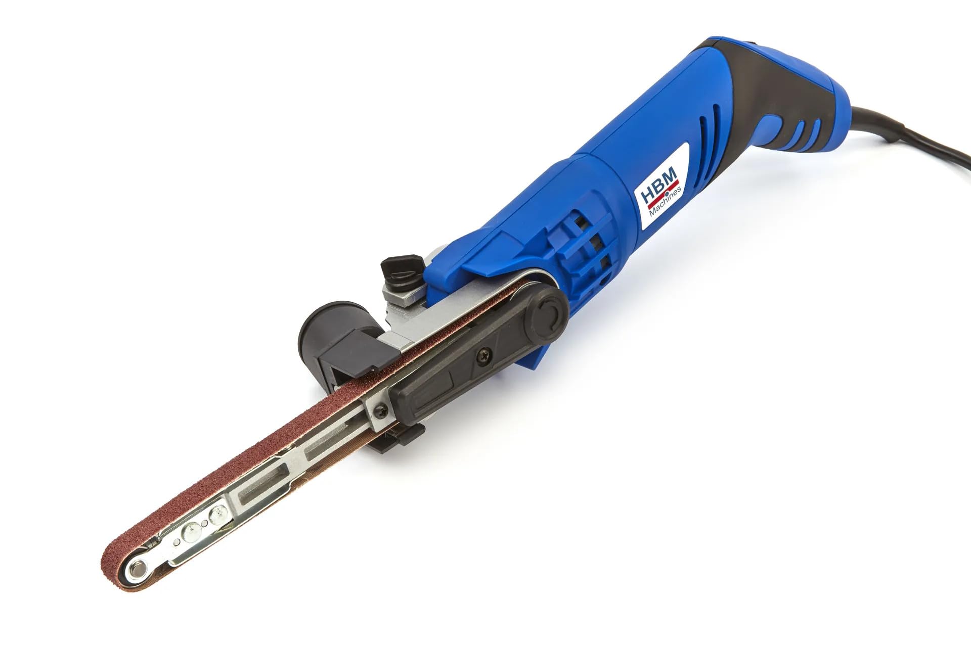 Image showing the HBM Powerfile 260 Watt Electric Belt Sander. Key components visible include the main body, the narrow sanding arm with abrasive belt, the dust extraction adapter, and the variable speed control dial.